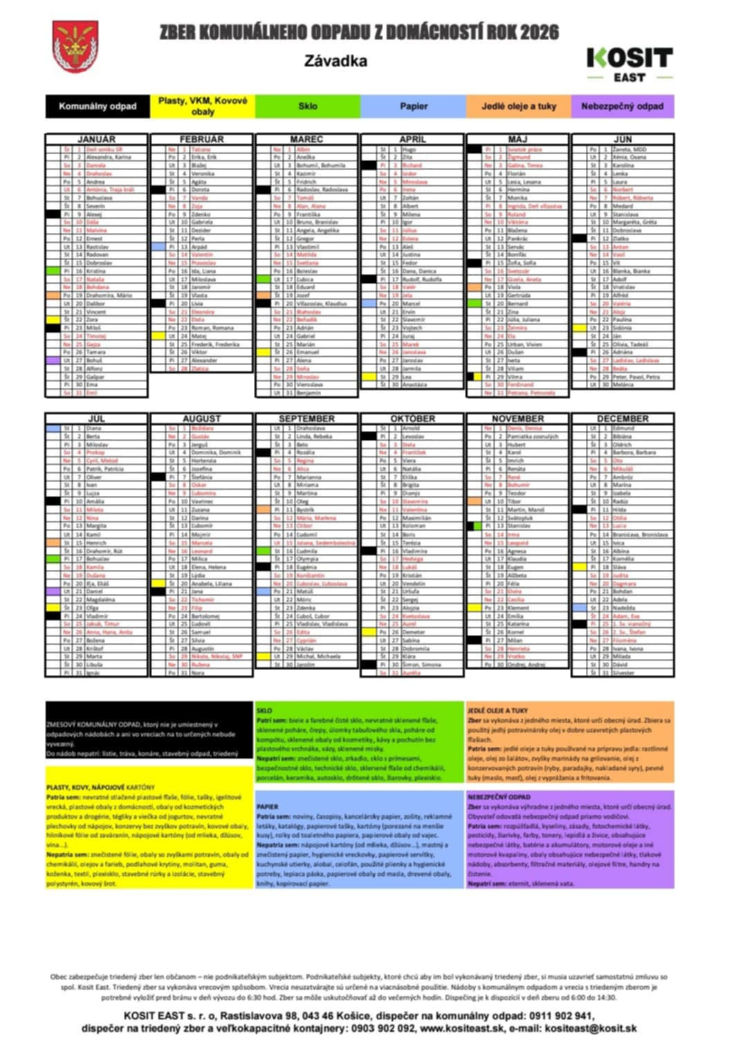 Kalendár vývozu TKO a triedeného zberu na rok 2026